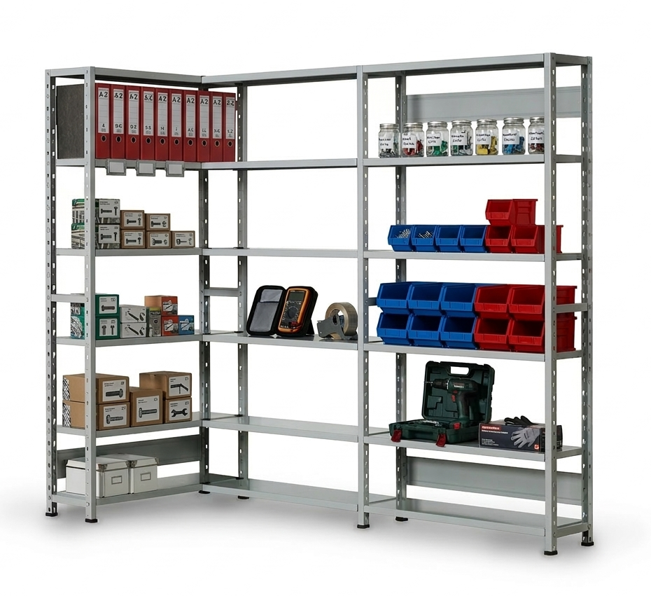 Estantería sin tornillos de sencillo montaje, ideal para archivos y oficinas. Medidas: de alto 200 cm o 250 cm de fondo 40 cm o 30 cm de largo 93 cm o 69 cm. Hay que tener en cuenta 3,5 cm que ocupa cada montante. Color gris RAL 7.035